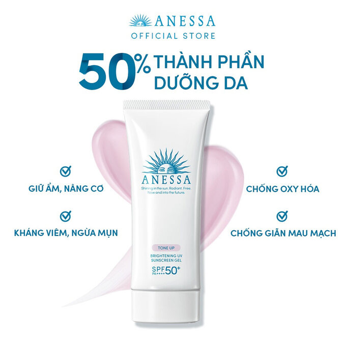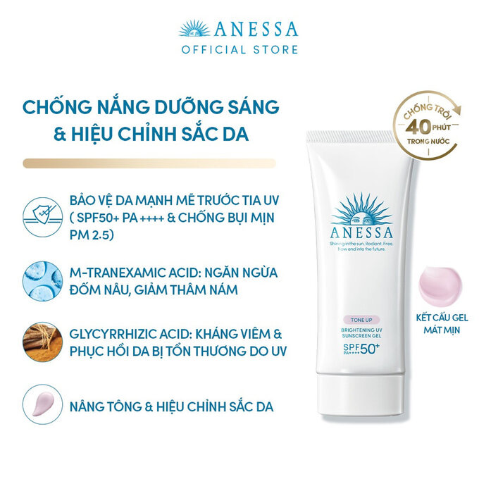 Anessa Brightening Uv Sunscreen Gel N SPF50+ PA++++ ứng dụng công nghệ Water Resistant cho khả năng chống nước lên đến 40 phút, đồng thời chống trôi do ma sát và bảo vệ da khỏi tác hại của bụi mịn PM2.5 hiệu quả. Bên cạnh đó, công thức sản phẩm còn được bổ sung thành phần dưỡng sáng da, hỗ trợ ngăn ngừa và giảm đốm nâu, thâm nám.